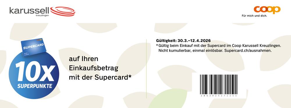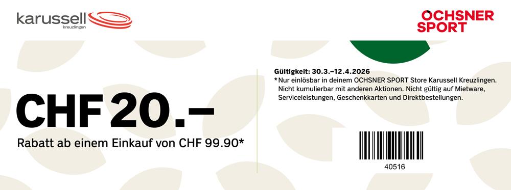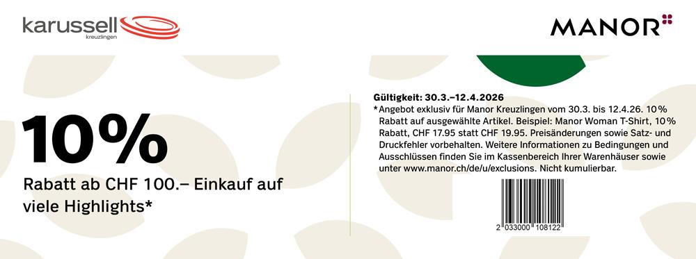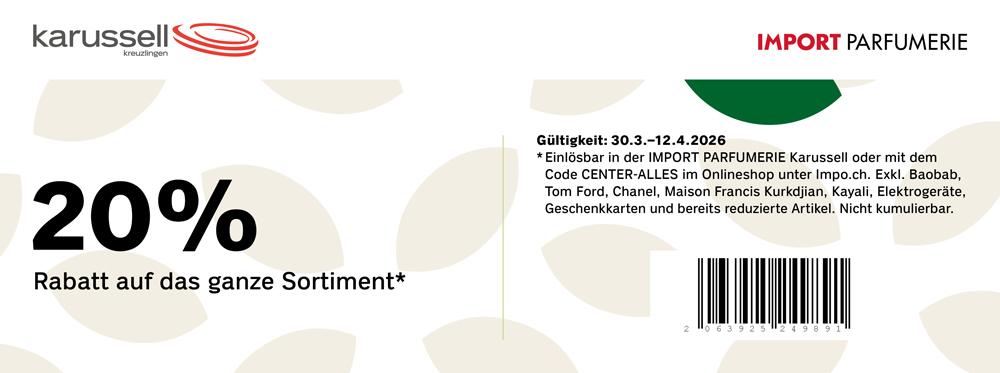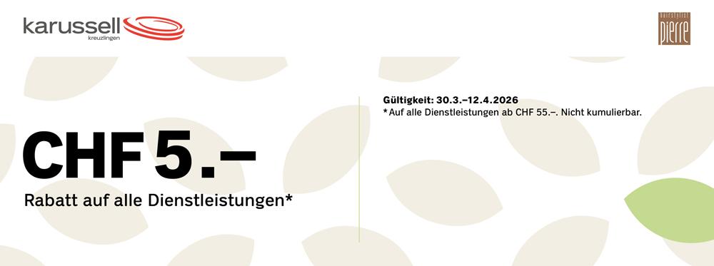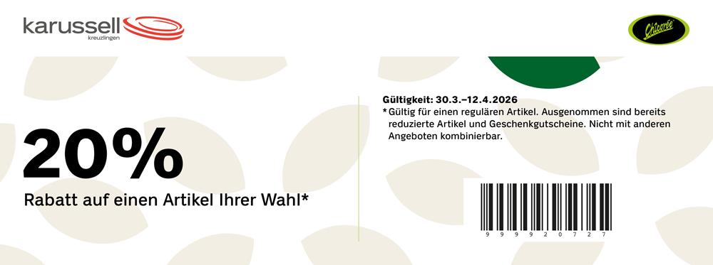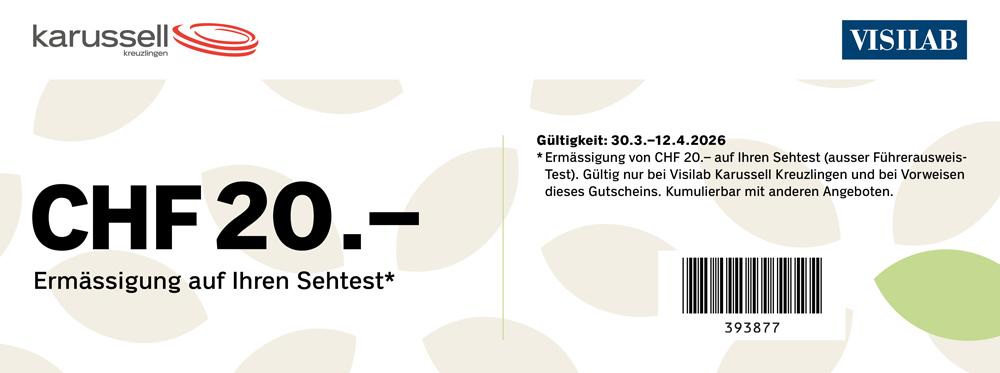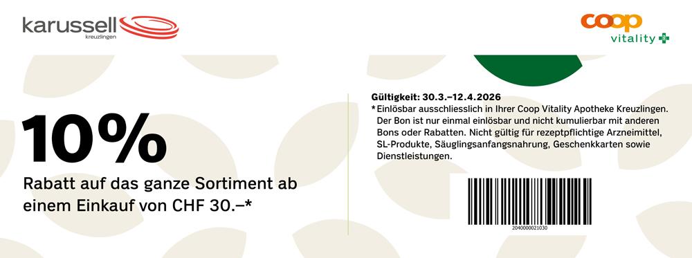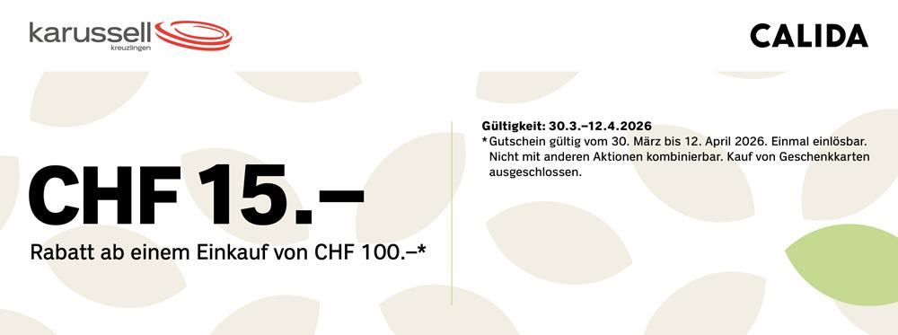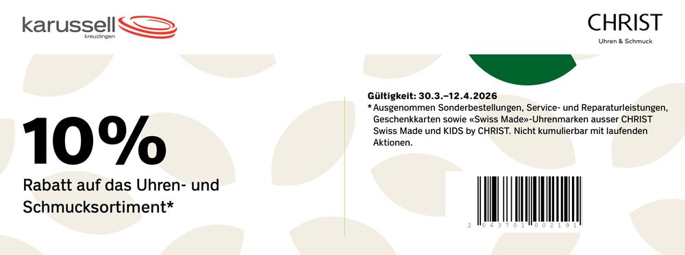 Einfach den Bon im Karussell Kreuzlingen im jeweiligen Geschäft vorweisen und von attraktiven Rabatten profitieren. Einlösbar ab dem 30.03.2026 in allen teilnehmenden Geschäften.